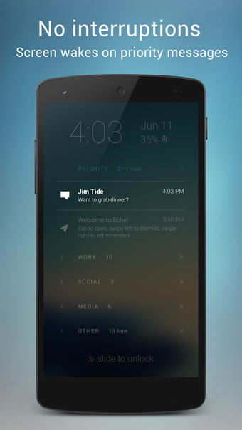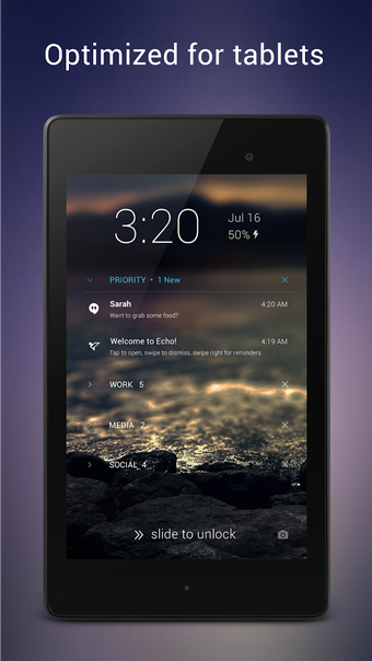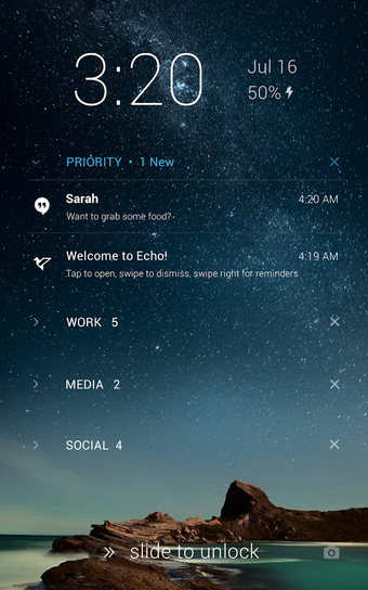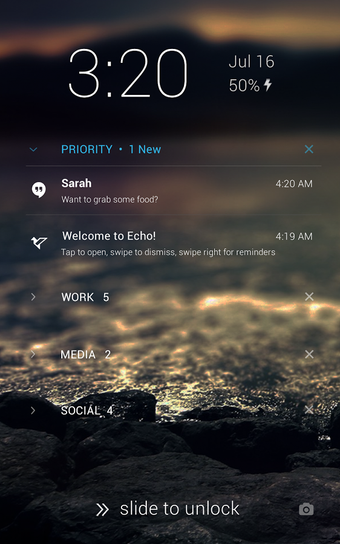 Echo Notification Lockscreen funciona en dispositivos móviles con S.O. Android 4.3 o posterior, y solo está disponible en Inglés. Su actual versión es 0.9.4 y su última actualización fue en 8/09/2014.
